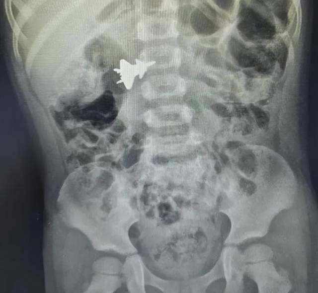 2023年6月份的时候,南宁4岁的男孩小明(化名)误吞了金属的玩具飞机。之后小孩的家人紧急将孩子送往医院,拍摄了一组X光检测图。